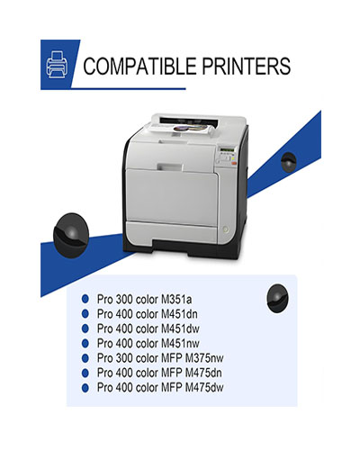 • Compatible with: Laser Jet Pro 300 color M351a; Laser Jet Pro 300 color MFP M375nw; Laser Jet Pro 400 color M451dn, M451dw, M451nw; Laser Jet Pro 400 color MFP M475dn, M475dw