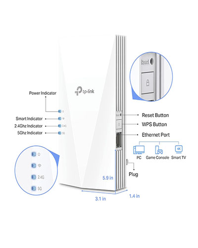 • WIFI BOOSTER WITH WIFI 6 SPEEDS: Enjoy smooth and reliable streaming, gaming, downloading, and more with dual-band total bandwidth of 1.5 Gbps (up to 1201 Mbps on 5 GHz and up to 300 Mbps on 2.4 GHz).