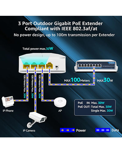 • 【1 in 3 out Outdoor PoE Extender】This 4 port waterproof gigabit PoE extender include 3 PoE out and 1 PoE in. It can provides PoE power to up to three PoE devices, 10/100/1000Mbps speed. Each PoE extender has an transmission distance of 330ft(100m).