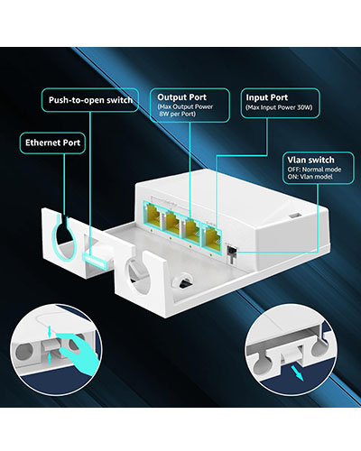 • 【VLAN and 3 Levels Cascade】Extra 330ft(100m) PoE+ data transmission can be extended through a YuanLey PoE repeater. And it supports 3 levels cascade, therefore, it can achieve PoE data transmission up to 1312ft with 3 PoE extender. Out Ports 1 – 3 support VLAN isolation, preventing data leakage, and increase network security.